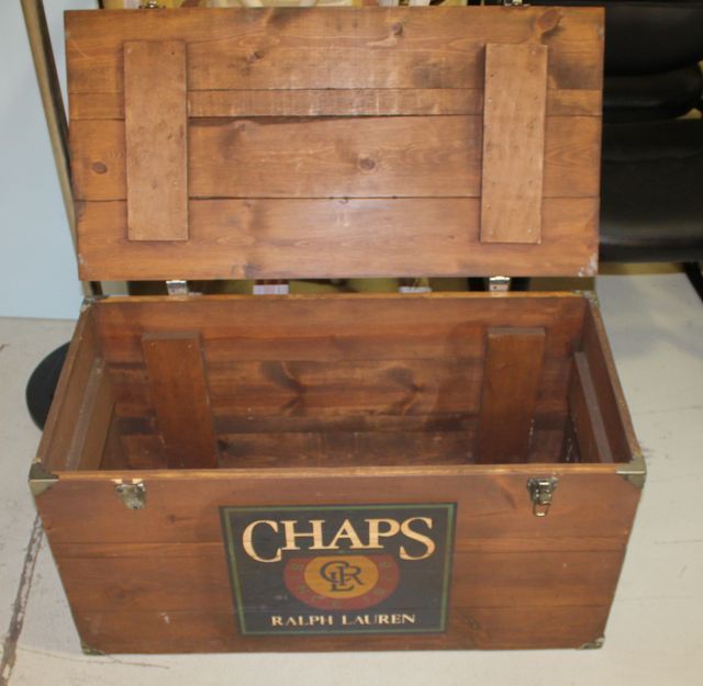 Wood Trunk Advertising Chaps Ralph Lauren, 36"w., 18"d., 18"h. Wood Trunk Advertising Chaps Ralph Lauren, 36"w., 18"d., 18"h.