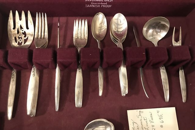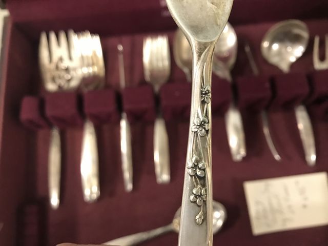 Sterling flatware by Lunt, 7 place spoons, 3 salad forks, soup spoon, cocktail fork, serving fork, 2 serving spoons, 5 place forks, 2 butter knives, 6 knives. 28 total pieces, with box. Sterling flatware by Lunt, 7 place spoons, 3 salad forks, soup spoon, cocktail fork, serving fork, 2 serving spoons, 5 place forks, 2 butter knives, 6 knives. 28 total pieces, with box.