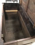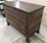 Large Oak lift top trunk, hand made, footed, lift top and drop down front door, latch needs repair, wood piece missing from where latch is, no key, trim work around feet are missing sections. 37"h., 52"w., 25"d. Large Oak lift top trunk, hand made, footed, lift top and drop down front door, latch needs repair, wood piece missing from where latch is, no key, trim work around feet are missing sections. 37"h., 52"w., 25"d.