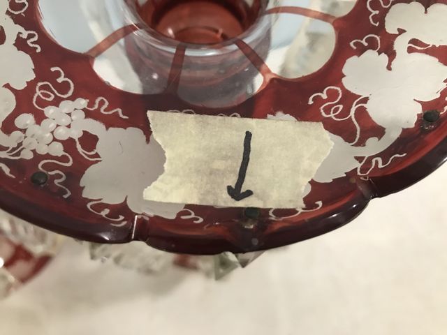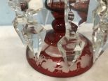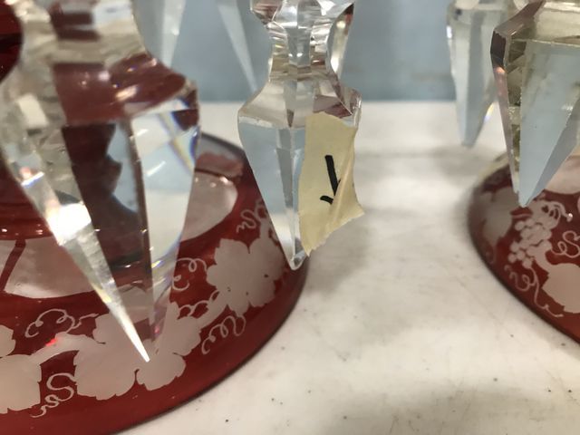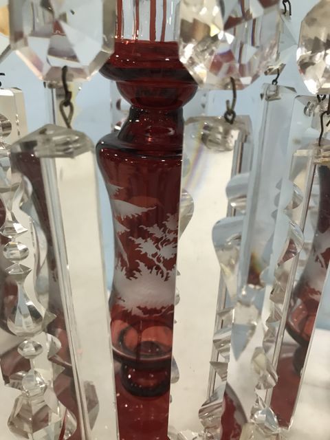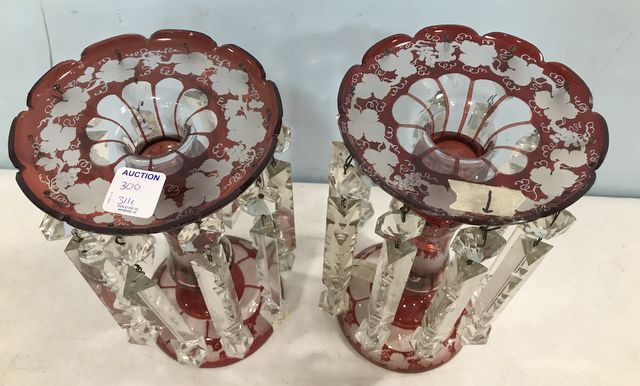 Pair of antique Bohemian Cranberry glass candle stick lusters, waterfall prisms, etched artwork, does have a few small chips. 10"h. Pair of antique Bohemian Cranberry glass candle stick lusters, waterfall prisms, etched artwork, does have a few small chips. 10"h.