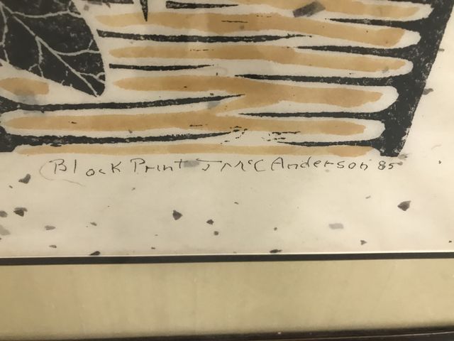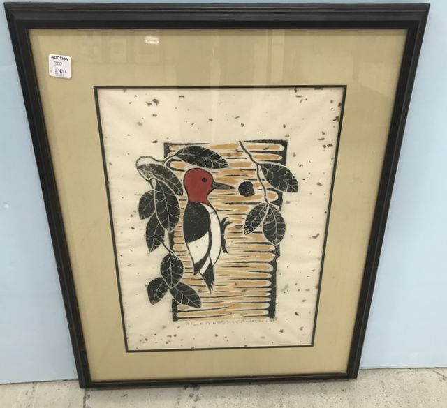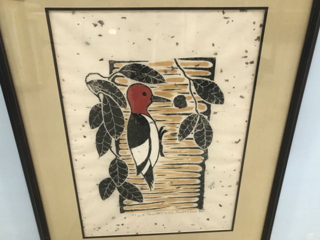Framed Wood Pecker block print by J MC Anderson 1985, 24"h., 19"w. James Anderson 1907-1998,American painter, muralist, and pottery designer and decorator, Walter Anderson's youngest brother. Framed Wood Pecker block print by J MC Anderson 1985, 24"h., 19"w. James Anderson 1907-1998,American painter, muralist, and pottery designer and decorator, Walter Anderson's youngest brother.