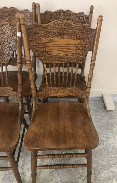 Four Oak Pressed Back Dining Chairs, needs cleaning, 44"h., matches lot 0354. Four Oak Pressed Back Dining Chairs, needs cleaning, 44"h., matches lot 0354.