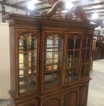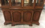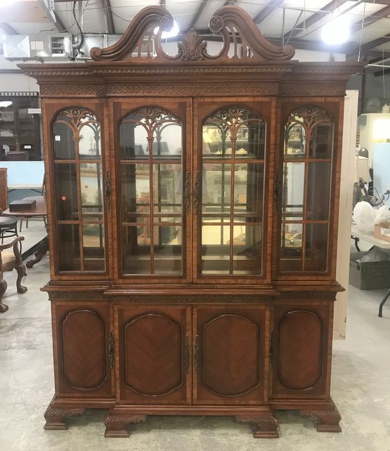 Modern Chippendale Style Four door inlay china cabinet, mirrored back, glass shelves, lighted, two pieces, four storage door on bottom with flatware drawer, needs cleaning, made in china, 91"h., 63"w., 19"d. Modern Chippendale Style Four door inlay china cabinet, mirrored back, glass shelves, lighted, two pieces, four storage door on bottom with flatware drawer, needs cleaning, made in china, 91"h., 63"w., 19"d.