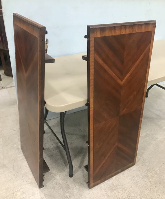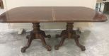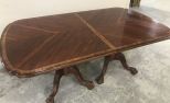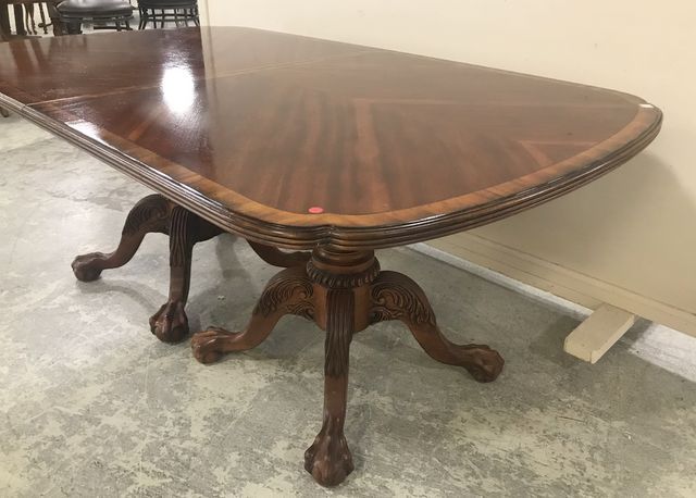 Modern Chippendale Style double pedestal Dining Table, ball-n-claw, inlaid border design, two leaves, has some wear on finish, needs cleaning, without leave it measures 30"h., 78"L., 34"w. Modern Chippendale Style double pedestal Dining Table, ball-n-claw, inlaid border design, two leaves, has some wear on finish, needs cleaning, without leave it measures 30"h., 78"L., 34"w.