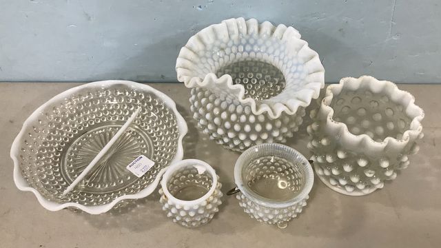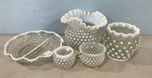 Opalescent hobnail divided dish, crimped vase, handled sugar, salt. largest vase is 5"h. Opalescent hobnail divided dish, crimped vase, handled sugar, salt. largest vase is 5"h.