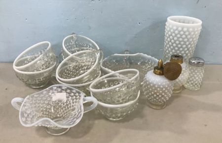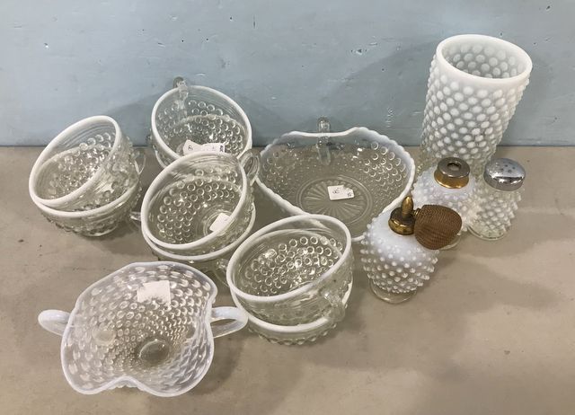 Opalescent hobnail cups (8), heart shaped bowl, vase 6"h., perfume, salt & pepper, basket vase. Opalescent hobnail cups (8), heart shaped bowl, vase 6"h., perfume, salt & pepper, basket vase.