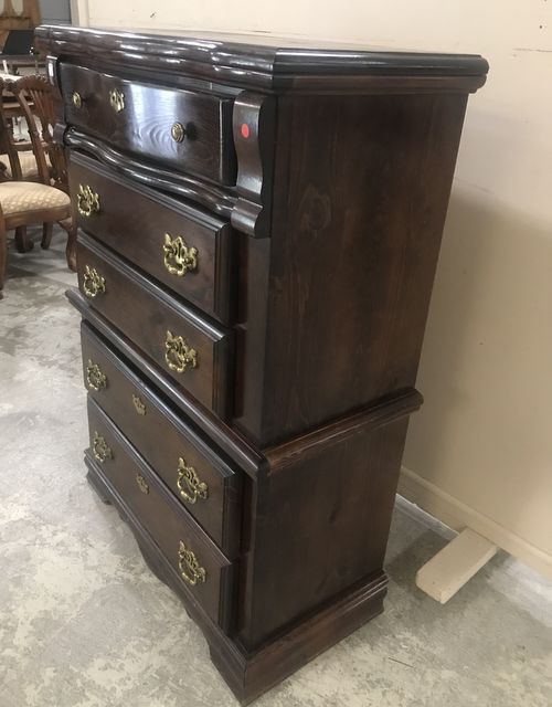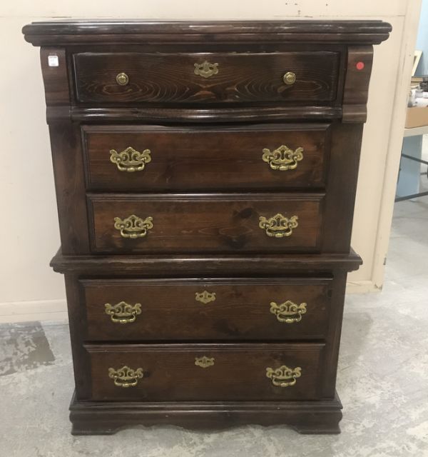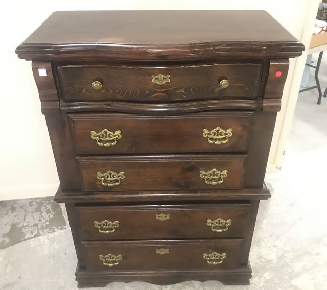 1980's stained pine finish, chest of drawers, similar to Ethan Allen, no label, brass hardware, five drawer, minor wear, drawers in working order, 54"h., 38"w., 18"d. 1980's stained pine finish, chest of drawers, similar to Ethan Allen, no label, brass hardware, five drawer, minor wear, drawers in working order, 54"h., 38"w., 18"d.