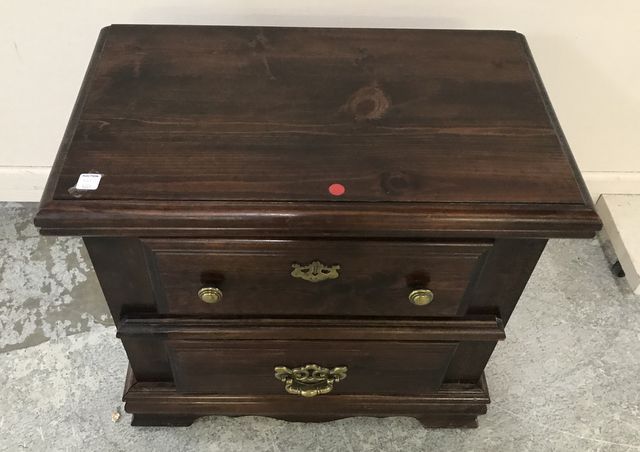 1980's Samuel Lawrence Stained Pine Nightstand, with slide out top with felt inside storage, two drawers (work good) needs some cleaning, 24"h., 27"w., 15"d. 1980's Samuel Lawrence Stained Pine Nightstand, with slide out top with felt inside storage, two drawers (work good) needs some cleaning, 24"h., 27"w., 15"d.