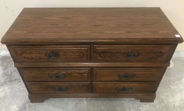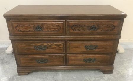 Sumter Co. freedom oak finish double dresser, comes with back mirror, 6 drawers, minor wear, drawers in working order, 30"h., 48"w., 19"d. Sumter Co. freedom oak finish double dresser, comes with back mirror, 6 drawers, minor wear, drawers in working order, 30"h., 48"w., 19"d.