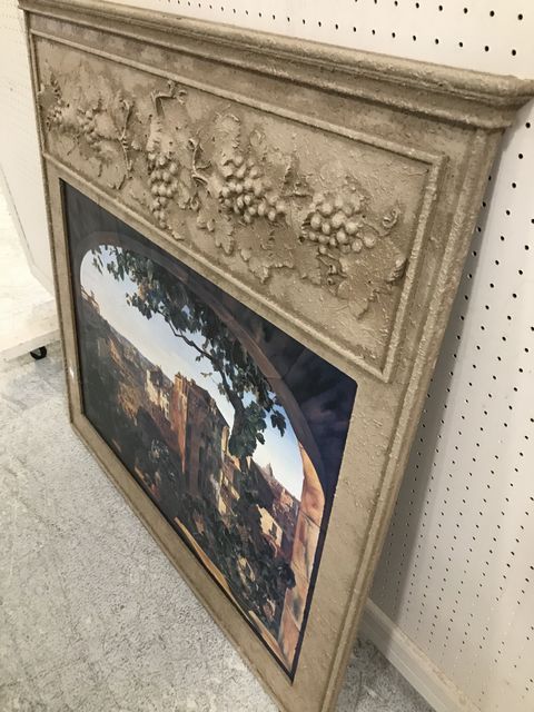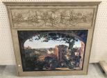 Modern Trumeau wall art with grapevine decor panel and European Print scene, 42"h., 42"w. Modern Trumeau wall art with grapevine decor panel and European Print scene, 42"h., 42"w.