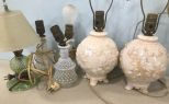 Three opalescent hobnail desk lamps (needs work), pressed glass lamp and shade 12"h., and Pair of Vintage Opalescent glass leaf pattern lamps 17"h. Three opalescent hobnail desk lamps (needs work), pressed glass lamp and shade 12"h., and Pair of Vintage Opalescent glass leaf pattern lamps 17"h.