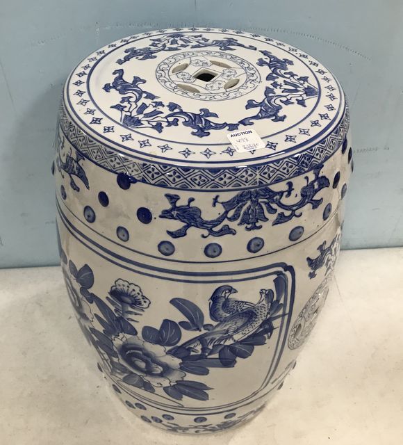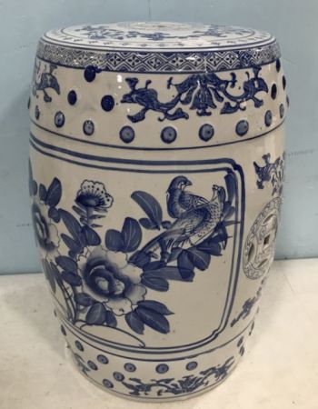 Blue & White Oriental Garden Seat, porcelain, no damage, 18"h., 10"dia. Blue & White Oriental Garden Seat, porcelain, no damage, 18"h., 10"dia.