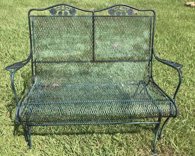 Wrought iron glider bench, black painted, mesh sit. Wrought iron glider bench, black painted, mesh sit.