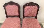 Pair of Chippendale reproduction mahogany side chairs, pink upholstery, carved designs, 38"h. Pair of Chippendale reproduction mahogany side chairs, pink upholstery, carved designs, 38"h.
