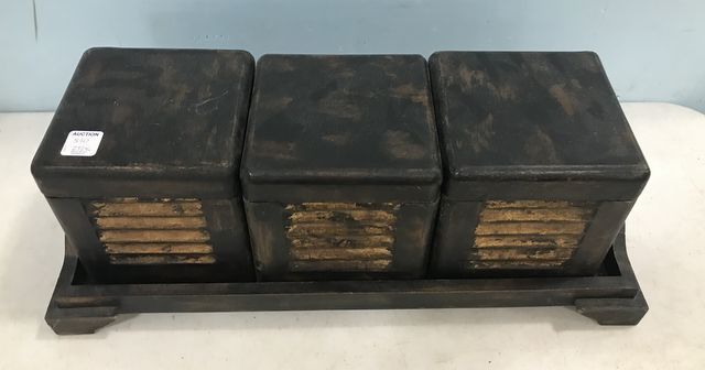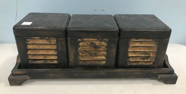 Rustic Modern Wood Containers and Tray, Three wood lift top containers/boxes with footed tray, 20"w., 8"d. Rustic Modern Wood Containers and Tray, Three wood lift top containers/boxes with footed tray, 20"w., 8"d.