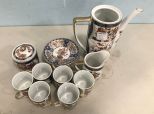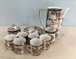 Japanese Empress porcelain tea set, pitcher (no lid), sugar, creamer, cups, and saucers. Japanese Empress porcelain tea set, pitcher (no lid), sugar, creamer, cups, and saucers.