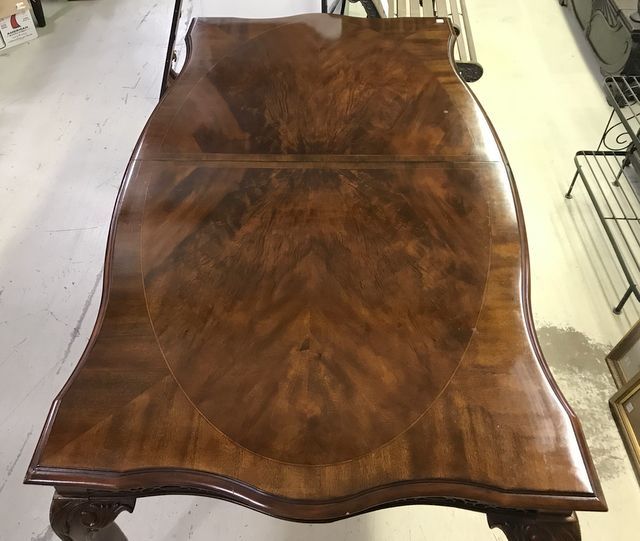 Chippendale style burl mahogany four leg ball-n-claw dining table, curved sides, two leaves, oval inlay top medallion, modern reproduction, has swirls, and some scratches on finish. without leaves, 30"h., 84"L., 35"d. Chippendale style burl mahogany four leg ball-n-claw dining table, curved sides, two leaves, oval inlay top medallion, modern reproduction, has swirls, and some scratches on finish. without leaves, 30"h., 84"L., 35"d.