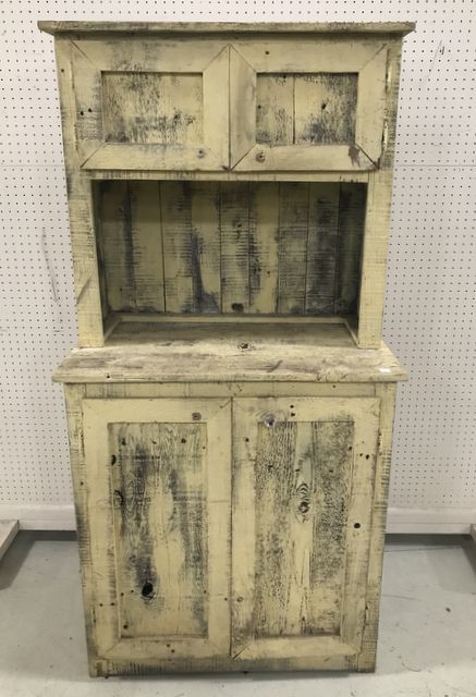 Reclaimed Wood Primitive Style Painted Hutch, two piece, painted and distressed, double door with inner shelve, 66"h., 33"w., 19"d. Reclaimed Wood Primitive Style Painted Hutch, two piece, painted and distressed, double door with inner shelve, 66"h., 33"w., 19"d.