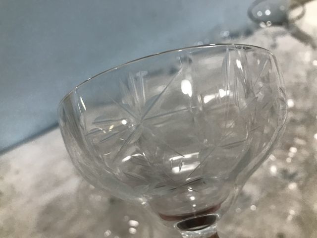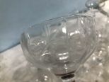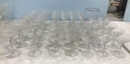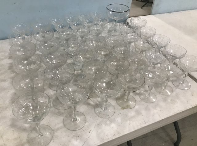 46 total couple etched stemware glasses 6"h., 5"h., matching etched glass compote. 46 total couple etched stemware glasses 6"h., 5"h., matching etched glass compote.