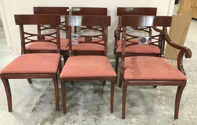 Duncan Phyfe vintage dining chairs, good condition, four sides, two arms, 35"h. Duncan Phyfe vintage dining chairs, good condition, four sides, two arms, 35"h.