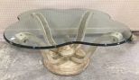 Modern clover leaf glass top coffee table, ornate distressed four arm base, 19"h., 48"w. Modern clover leaf glass top coffee table, ornate distressed four arm base, 19"h., 48"w.