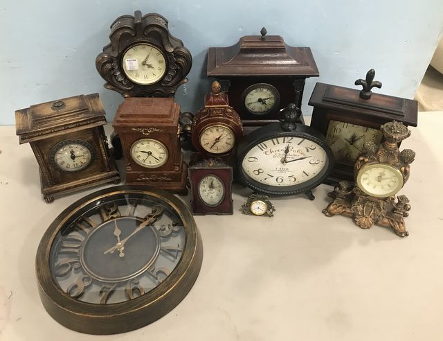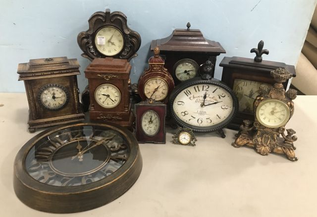 11 resin battery powered mantle and shelf clocks, multiple designs and style, footed, and ornate. 11 resin battery powered mantle and shelf clocks, multiple designs and style, footed, and ornate.