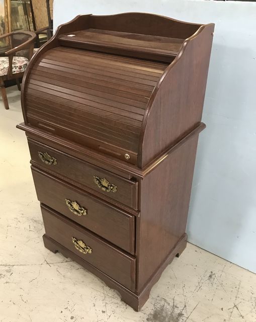 Riverside Furniture Modern Roll Stop Secretary Cabinet, inner divided shelves, three drawers, illuminate wood, 46"h., 24"w., 19"d. Riverside Furniture Modern Roll Stop Secretary Cabinet, inner divided shelves, three drawers, illuminate wood, 46"h., 24"w., 19"d.