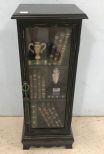 Modern Faux Book Single Door Cabinet, front glass door with faux book design, three shelves, black, 26"h., 10"w., 8"d. Modern Faux Book Single Door Cabinet, front glass door with faux book design, three shelves, black, 26"h., 10"w., 8"d.
