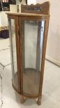 Vintage single door curio, bow side glass (one has crack), glass front door (needs adjusting to lock), mirrored backsplash, oak finish, wood shelves, lighted, 61"h., 31"w., 15"d. Vintage single door curio, bow side glass (one has crack), glass front door (needs adjusting to lock), mirrored backsplash, oak finish, wood shelves, lighted, 61"h., 31"w., 15"d.