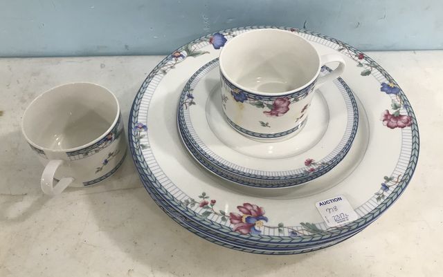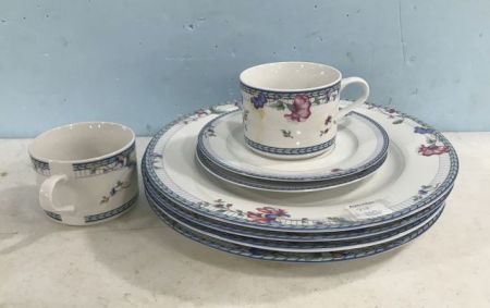 Four dining plates, two dessert plates, two mugs. Four dining plates, two dessert plates, two mugs.
