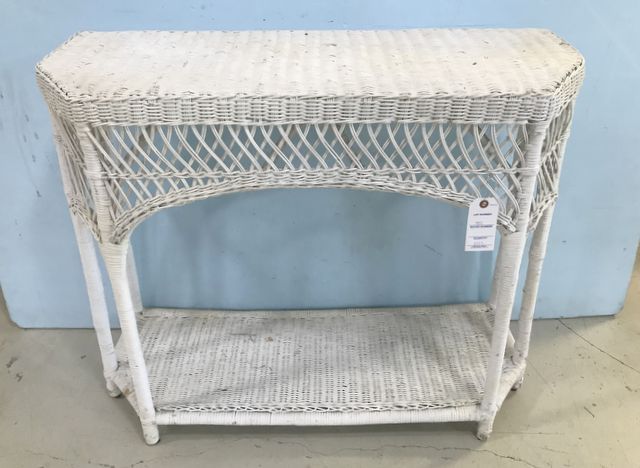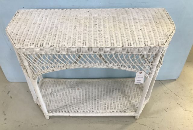 White wicker wall console, two tier, has some paint chips, minor wicker wear, 31"h., 36"w., 14"d. White wicker wall console, two tier, has some paint chips, minor wicker wear, 31"h., 36"w., 14"d.