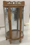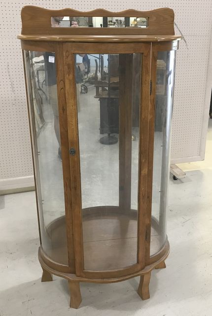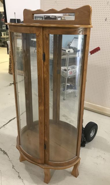 Vintage single door curio, bow side glass panels, front door glass, has key, wood shelves, oak finish, mirrored back splash, lighted, 61"h., 30"w., 15"d. Vintage single door curio, bow side glass panels, front door glass, has key, wood shelves, oak finish, mirrored back splash, lighted, 61"h., 30"w., 15"d.