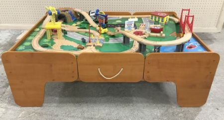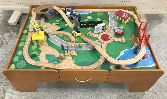 Child's play table with wood train set, 15"h., 48"w., 33"d. Child's play table with wood train set, 15"h., 48"w., 33"d.