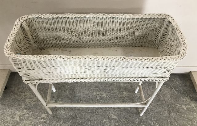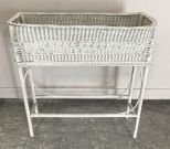 White painted wicker planter, 33"h., 32"w. White painted wicker planter, 33"h., 32"w.