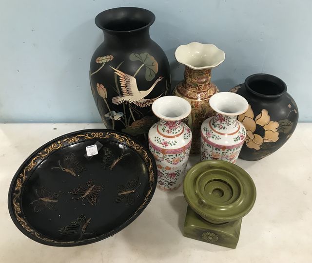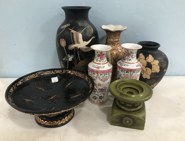 Two Ceramic black bird design vase 15"h., 9"h., resin ornate black compote, Chinese Satsuma Style hand painted vase, Pair of Chinese white porcelain vases, Japanese ceramic candle holder. Two Ceramic black bird design vase 15"h., 9"h., resin ornate black compote, Chinese Satsuma Style hand painted vase, Pair of Chinese white porcelain vases, Japanese ceramic candle holder.
