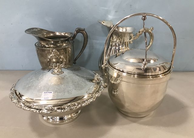 Keystone silver plated pitcher 8"h., Poole footed water pitcher, Oneida covered dish, ice bucket with milk glass insert. Keystone silver plated pitcher 8"h., Poole footed water pitcher, Oneida covered dish, ice bucket with milk glass insert.