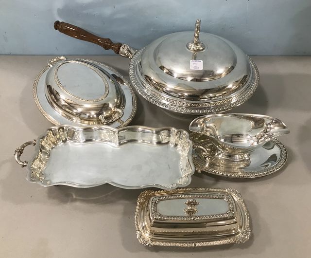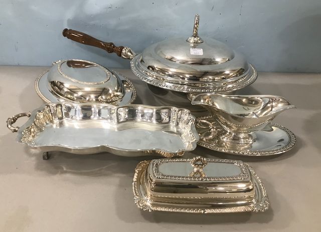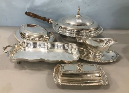 Silver plated handled kettle, meat dish, footed tray, butter dish, gray boat. Silver plated handled kettle, meat dish, footed tray, butter dish, gray boat.