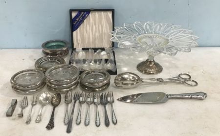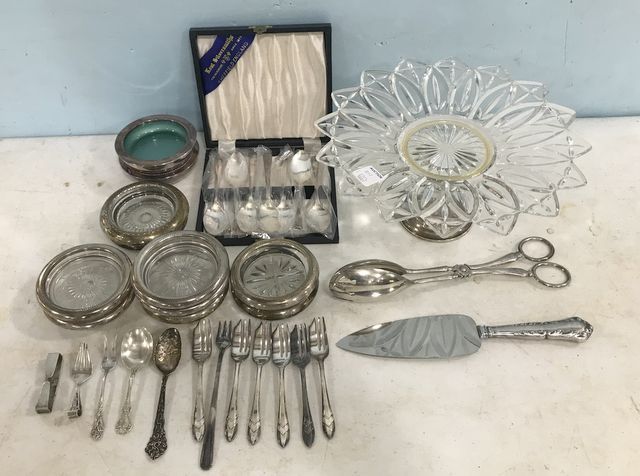 Weighted sterling base glass compote 5"h., 11"dia., tongs, cocktail forks, coasters, Sheffield spoons, cake knife, sterling demitasse spoon, small Towle Old Master spoon Sterling, sterling cocktail fork, clip. Weighted sterling base glass compote 5"h., 11"dia., tongs, cocktail forks, coasters, Sheffield spoons, cake knife, sterling demitasse spoon, small Towle Old Master spoon Sterling, sterling cocktail fork, clip.
