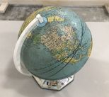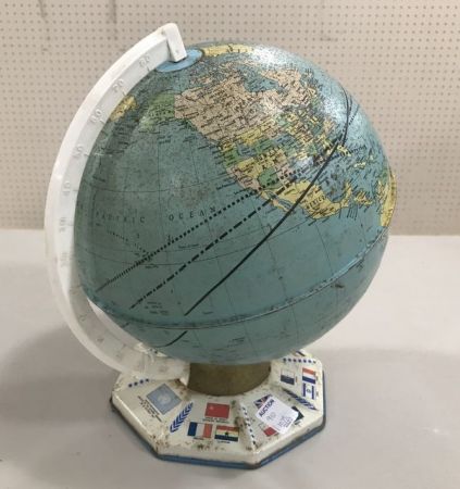 Small vintage tin globe on stand, 12"h. Small vintage tin globe on stand, 12"h.