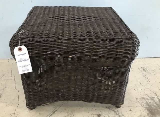 Painted wicker ottoman/small table, has some minor paint chips, 16"h., 18"sq. Painted wicker ottoman/small table, has some minor paint chips, 16"h., 18"sq.