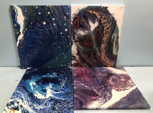 Canvas, largest 24"h., 20"w., multi color and designs, hand made locally by Hinton. Canvas, largest 24"h., 20"w., multi color and designs, hand made locally by Hinton.