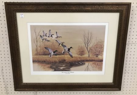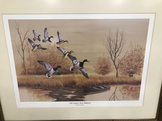 Old Cypress Boat Mallards by Bob Tompkins, artist proof print, signed and numbered 69/200, framed, matted, 26"h., 33"w. Old Cypress Boat Mallards by Bob Tompkins, artist proof print, signed and numbered 69/200, framed, matted, 26"h., 33"w.