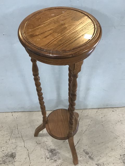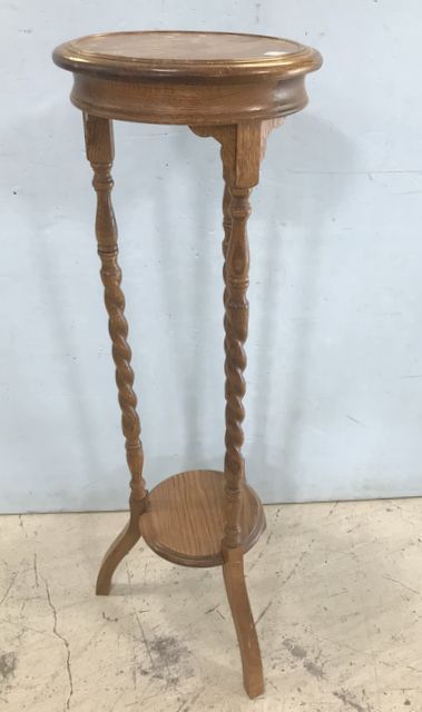 Oak Barley twist plant stand, two tier, needs tightening, has some wear, 39"h., 12"dia. Oak Barley twist plant stand, two tier, needs tightening, has some wear, 39"h., 12"dia.