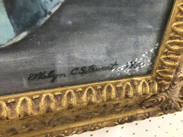 Vintage Still Life Painting of Vase and Bowl by C. Stewart, 1930's, has some moisture damaged areas, gold gilt wood framed, glass front, 22"h., 26"w. Vintage Still Life Painting of Vase and Bowl by C. Stewart, 1930's, has some moisture damaged areas, gold gilt wood framed, glass front, 22"h., 26"w.