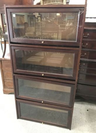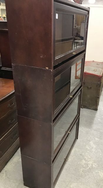 Four shack bookcase with glass doors, stack have pegs, third door needs work, has finish wear, pressed wood, 62"h., 33"w. Four shack bookcase with glass doors, stack have pegs, third door needs work, has finish wear, pressed wood, 62"h., 33"w.