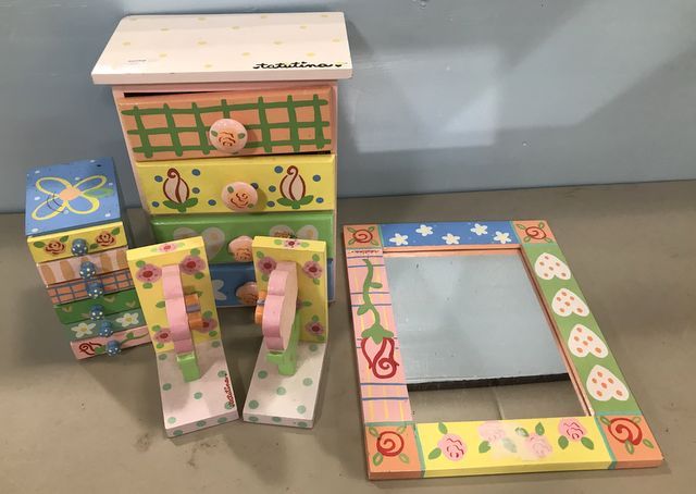 Tatutina hand painted four drawer trinket chest 15"h., 11"w., small 6 drawer trinket chest, and two tree design bookends, and Tatutina hand painted mirror 18"h. 14"w. Tatutina hand painted four drawer trinket chest 15"h., 11"w., small 6 drawer trinket chest, and two tree design bookends, and Tatutina hand painted mirror 18"h. 14"w.