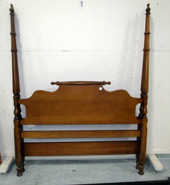 Colonial style maple four poster bed, has metal rails, has finials, has some minor rub wear on finish, 54"w., 72"h. Colonial style maple four poster bed, has metal rails, has finials, has some minor rub wear on finish, 54"w., 72"h.