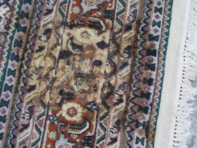 Hand made with 100 percent wool, green, brown, black, white, has a damaged spot, 9'9 x 13'5. Hand made with 100 percent wool, green, brown, black, white, has a damaged spot, 9'9 x 13'5.
