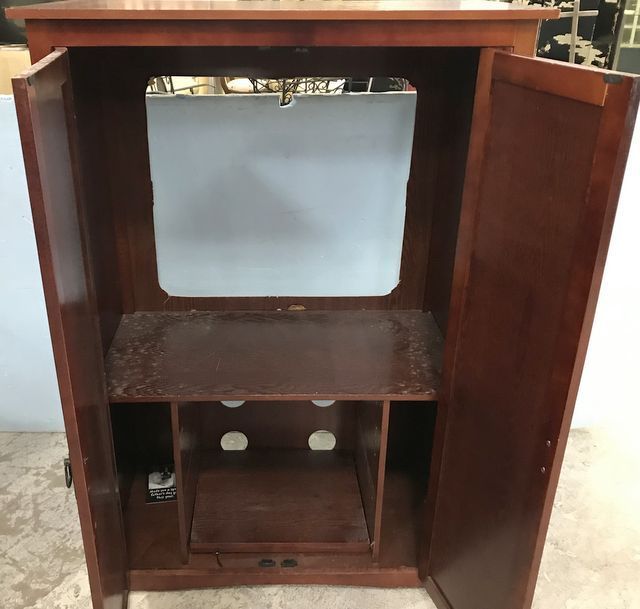 Made in China modern cabinet, double door with tv stand inside, panel back, pressed wood structure, has some wear, 56"h., 38"w., 20"d. Made in China modern cabinet, double door with tv stand inside, panel back, pressed wood structure, has some wear, 56"h., 38"w., 20"d.
