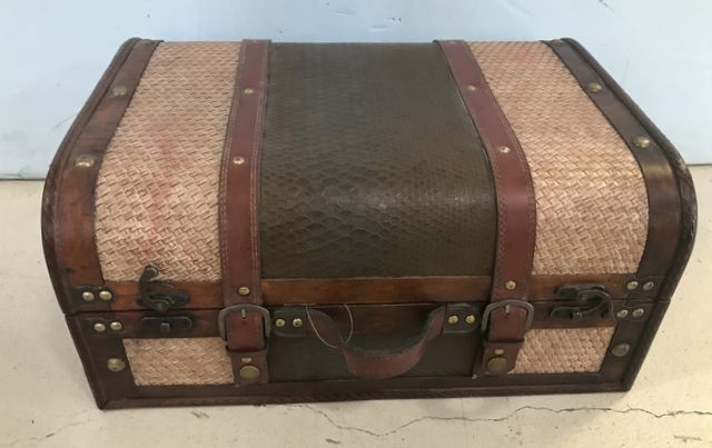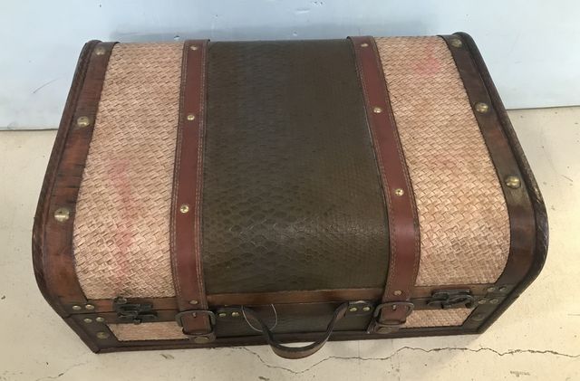 Modern Decor Faux Alligator Storage Case, wood, latches, decor, lift top storage, has wear on sides, 8"h., 18"w., 13"d. Modern Decor Faux Alligator Storage Case, wood, latches, decor, lift top storage, has wear on sides, 8"h., 18"w., 13"d.